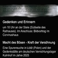 Er ist keine Pflichtveranstaltung, sondern ein Bekenntnis zur Verantwortung, zum Ziehen von Lehren aus der Geschichte – besser noch: ein Prüfstein zur Verankerung der Menschenwürde in Gegenwart und Zukunft. Der Holocaustgedenktag erinnert an eine der schlimmsten Phase menschlicher Barbarei, die glücklicherweise mit der Befreiung von Auschwitz ein Ende fand; ein Hoffnungsschimmer für eine bessere Zukunft.   Ist die Geschichte der Menschheit eine von Krieg und Gewalt oder eine von Nächstenliebe und Hoffnung? Seit 1945 gab es zahlreiche Wendepunkte zum Besseren, aber auch einige Rückschritte. Das Jahr 2026 hat begonnen. Es scheint ein Jahr zu werden, das in zahlreichen politischen und gesellschaftlichen Ebenen eher mehr Fragen aufwirft als Antworten zu geben. Gleichgültige Ohnmacht oder lebendiges Eintreten für die Demokratie? Der Holocaustgedenktag wird mehr und mehr zu einem Gradmesser der Selbstprüfung. Die Stadt Hann. Münden lädt ein: 27.01.2026 ab 18 Uhr Gedenkansprachen an der Stele an der Südseite des Rathauses von Bürgermeister Tobias Dannenberg, Sarah Heerlein und Stefan Schäfer Stilles Gedenken Anschließend im Corvinushaus:  Bildvortrag „Macht des Bösen – Kraft der Versöhnung“ Eine Bildungsreise führte Stefan Schäfer im September 2025 für eine Woche nach Łódź in Polen. Nach dem Überfall auf Polen durch die Wehrmacht wurde Lodsch, wie es von der dort lebenden deutschen Minderheit genannt wurde, in Litzmannstadt umbenannt und in das Deutsche Reich eingegliedert. Zuvor wurden in der pulsierenden Industriemetropole Polnisch, Jiddisch, Deutsch und Russisch gesprochen. 1940 errichteten die deutschen Besatzer mitten in der Stadt das jüdische Ghetto Litzmannstadt. Es folgte die Errichtung des Vernichtungslagers Kulmhof unweit von Łódź und die schrittweise Räumung des Ghettos. Ab Dezember 1941 begann dann der Massenmord. Litzmannstadt sollte so etwas wie eine „deutsche Musterstadt“ werden. Am 01.01.1926 wurde in Łódź Leon Weintraub geboren. 1940 steckte man ihn mit seiner jüdischen Familie ins Ghetto, bevor man ihn 1944 nach Auschwitz verschleppte. Wie durch ein Wunder überlebte er die Shoah. Mit unbändiger Energie und Lebenskraft steht er bis heute als Zeitzeuge für das Wachhalten der Erinnerung, aber auch für die Verständigung ein. Wir durften ihn im November 2024 in unserer Stadt erleben. Durch ihn entstand eine unvergessliche Reise, die nicht nur Einblicke in die Abscheulichkeit der Barbarei gab, sondern auch die Wärme der Versöhnung zeigte.  „Denkst du bisweilen darüber nach, was passieren wird, wenn es irgendwann einmal keine Holocaust-Überlebenden mehr gibt?“ „Ich bin Optimist. Wenn ich an etwas glaube, dann ist es der menschliche Verstand, der derartige Verbrechen nicht mehr zulassen wird“, schrieb Leon Weintraub an Magda Jaros im Interview der gemeinsamen Biografie „Die Versöhnung mit dem Bösen“. Das bedeutet nichts anderes, als dass die Verantwortung, danach zu handeln, in unsere Hände gelegt wird.