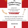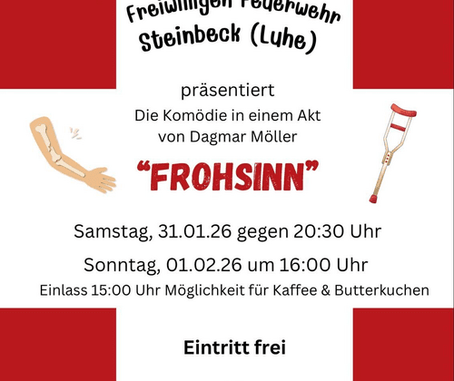 Die Theatergruppe der Freiwilligen Feuerwehr Steinbeck (Luhe) präsentiert die Komödie ein einem Akt von Dagmar Möller "FROHSINN" Sonntag, 01.02.2026 um 16.00 Uhr. Einlass um 15.00 Uhr mit dem Angebot von Kaffee & Butterkuchen.