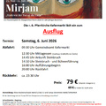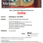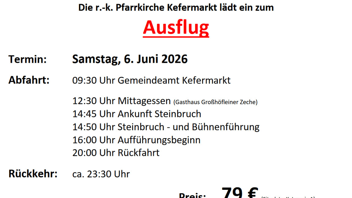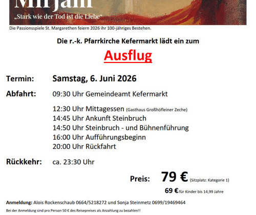 Ausflug zu den Passionsspielen - Mirjam "Stark wie der Tod ist die Liebe"09:30 Uhr Abfahrt beim Gemeindeamt Kefermarkt12:30 Uhr Mittagessen (Gasthaus Großhöfleiner Zeche)14:45 Uhr Ankunft Steinbruch14:50 Uhr Steinbruch - und Bühnenführung16:00 Uhr Aufführungsbeginn20:00 Uhr RückfahrtRückkehr:     ca. 23:30 Uhr Preis: € 79,00Anmeldung bei Alois Rockenschaub (0664/5218272) oder bei Sonja Steinmetz (0699/19469464)