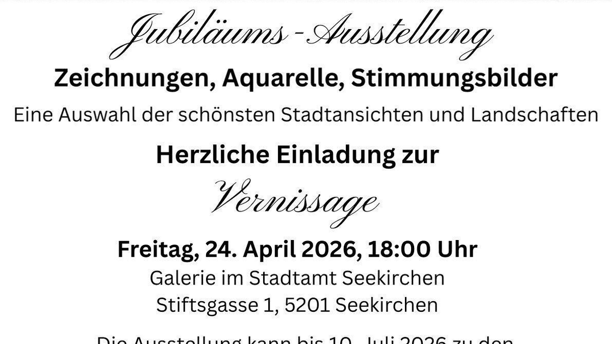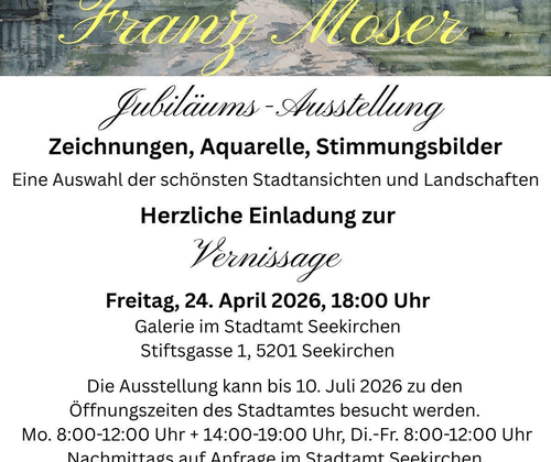 Herzliche Einladung zur Vernissage am Freitag, 24. April 2026, um 18:00 Uhr in der Galerie im Stadtamt Seekirchen, Stiftsgasse 1, 5201 Seekirchen. Gezeigt wird eine Auswahl der schönsten Stadtansichten & Landschaften von Franz Moser – von detaillierten Zeichnungen über lebendige Aquarelle bis hin zu stimmungsvollen Bildern. Die Ausstellung kann bis 10. Juli 2026 während der Öffnungszeiten des Stadtamtes besucht werden.