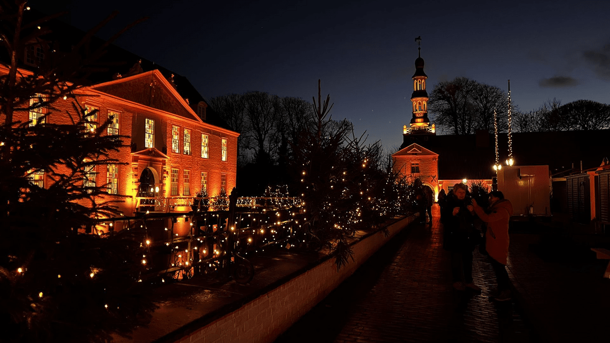 Vor der Kulisse des barocken Wasserschlosses öffnet einer der stimmungsvollsten Weihnachtsmärkte Ostfrieslands seine Tore. Rund um das illuminierte Schloss erwarten dich liebevoll geschmückte Hütten mit Kunsthandwerk, regionalen Spezialitäten und heißen Getränken. Im Schloss und den Nebengebäuden präsentieren Kunsthandwerkerinnen und Kunsthandwerker ihre Arbeiten – von Holz- und Keramikobjekten bis zu feinen Schmuckstücken und winterlichen Dekorationen. Auf der Bühne im Weihnachtsdorf und im Rittersaal sorgen Livemusik und kleine Darbietungen für Unterhaltung. Auch die traditionelle Tombola und der Besuch des Weihnachtsmanns gehören dazu und machen den Bummel über den Schlossplatz komplett. Wenn am Abend das Schloss in warmem Licht erstrahlt, zeigt sich die ganze Kulisse von ihrer festlichsten Seite – lebendig, stimmungsvoll und voller Vorfreude auf die schönste Zeit des Jahres.