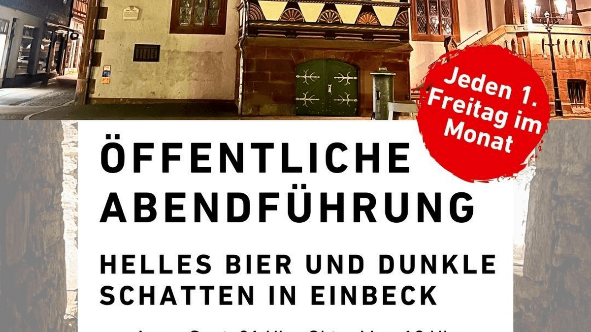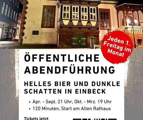 Hier erlebt man Fachwerkhäuser, Diekturm und Kirchen einmal im Dämmerlicht und schnuppert Höhenluft bei einer Turmbesteigung der Marktkirche St. Jacobi. Zum Abschluss gibt es bei einem frisch gezapften Bier oder kühlen Softgetränk noch interessante Geschichten rund um die Einbecker Braugeschichte. Highlight: Turmbesteigung Marktkirche St. Jacobi, Diekturm, frisch gezapftes Bier bzw. alkoholfreies Getränk (0,25 l) Treffpunkt: Altes Rathaus, Einbeck Wann: April - Oktober: 21:00 Uhr, November- März: 19:00 Uhr, jeden 1. Freitag im Monat Dauer: 2 Std. Preis: 12€ p.P. inkl. MwSt. Information Um Voranmeldung bei der Tourist-Information Einbeck wird gebeten (Tel.: +49 55 61 / 916 - 555, E-Mail: touristinfo@einbeck.de). Weitere Führungen durch die Stadt Einbeck sind hier einzusehen. Erlebnisprogramme sind hier zu finden.