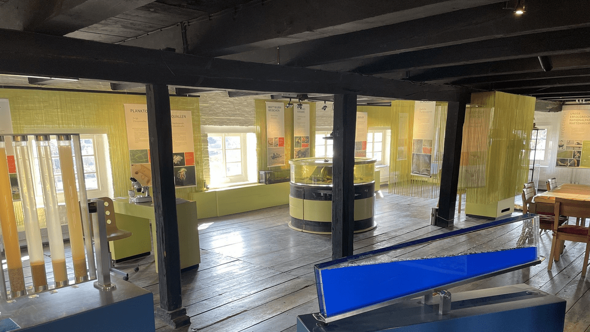 Durch das urige Haus der "Alten Pastorei" geht es hinauf in und durch unsere Wattenmeer Ausstellung. Wir widmen uns Themen, wie den genauen Hintergründen hinter Ebbe und Flut, dem Watt und aus was es besteht, seinen Bewohnenden, den verschiedenen Lebensräumen im Nationalpark und unseren Zugvögeln hier im Wattenmeer. Fragen und ein individueller Austausch sind hierbei immer möglich. Zuletzt widmen wir uns unserem Nordsee-Aquarium und kommen bei einer Fütterung der Tiere darin ins Staunen, während wir mit Informationen über sie versorgen.