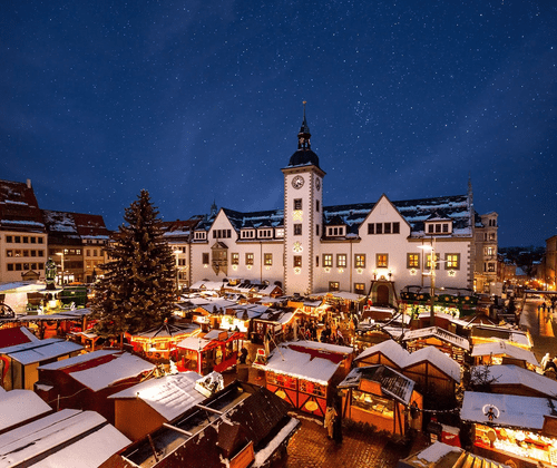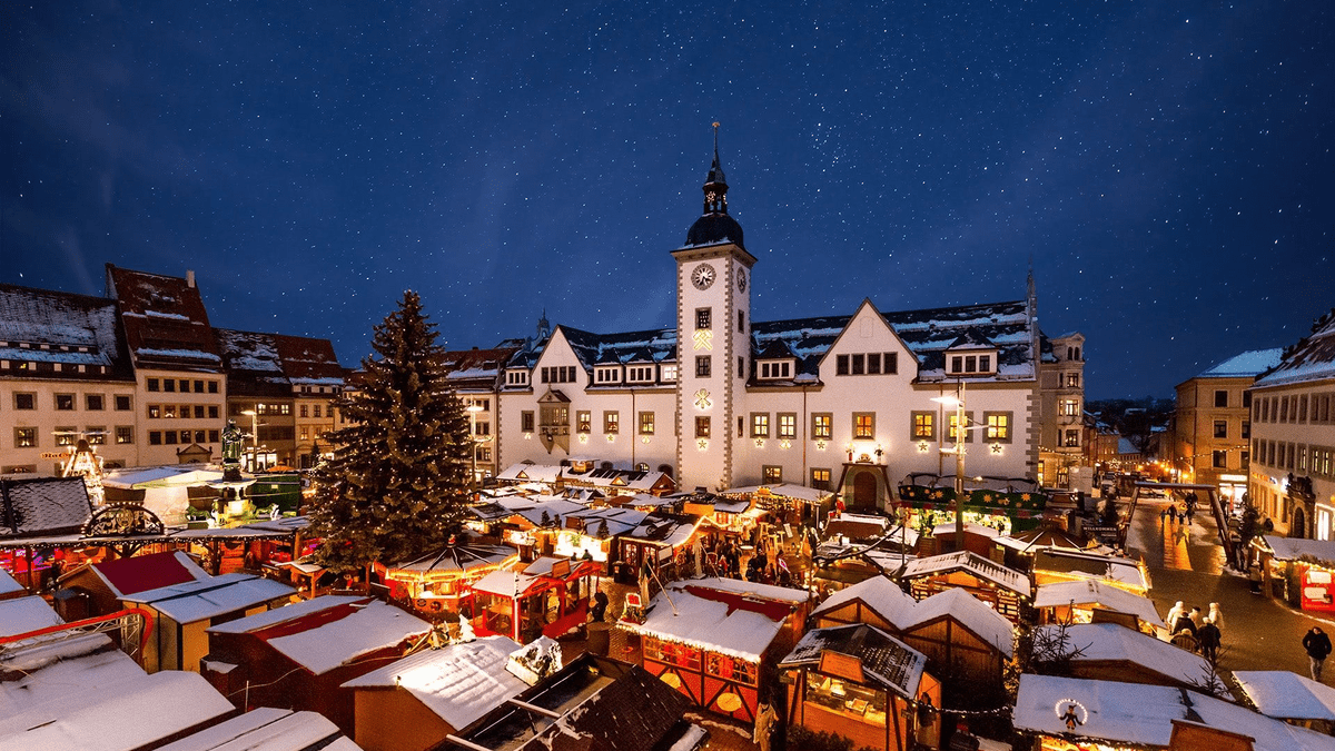 Original bergmännisch im Erzgebirge - so präsentiert sich der Freiberger Christmarkt jährlich von Dienstag vor dem 1. Advent bis 22. Dezember. Dann erstrahlt Freibergs mittelalterliche Altstadt im Lichterglanz und vor der Kulisse des historischen Obermarktes entsteht einer der schönsten Weihnachtsmärkte Deutschlands. Er lädt ein bergmännisches Brauchtum zu erleben, nach erzgebirgischer Holzkunst zu stöbern und die Adventszeit entspannt und gemütlich zu genießen. Rund 90 liebevoll ausgestaltete Holzhütten sind sowohl bergmännisch dekoriert, als auch in ihrem Angebot eng mit der Historie der Silberstadt verbunden. So sorgt der „Schmelzer“, der das Erz zu Silber schmolz, jetzt für leckeren Erzgebirgs-Glühwein. Auch die bergmännische Pyramide, das Stollenfest am 1. Advent, die Bergparade im Fackelschein mit anschließender Bergpredigt (immer samstags vor dem zweiten Advent), das Fest des Bergmanns mit einem kleinem Bergaufzug am 3. Advent, die „Kleine Bergwerkstatt“ zum Basteln für Kinder und das Einläuten der Freiberger Weihnachtsruhe lassen das Abenteuer Bergbau auf dem Freiberger Christmarkt lebendig werden. Zum gemütlichen Weihnachts-Einkaufs-Bummel laden über 250 Geschäfte in die festlich beleuchteten Altstadt-Gassen ein. Am 1. und 3. Advent finden verkaufsoffene Sonntage statt. Die Eisbahn im Schloss Freudenstein, Weihnachtsausstellungen, Bach-Oratorium im Dom. St. Marien, festliche Konzerte und romantische Laternenwanderungen runden den Silberstadt-Advent ab. Infos & Buchung: Tourist-Information Silberstadt®Freiberg Schloßplatz 6, 09599 Freiberg Telefon 03731 273664 www.freiberg.de/tourismus Christmarkt in Germany's Silver City: Freiberg Christmas Market From 25th November to 22nd December Original miners´ traditions in the Ore Mountain - this is how the Freiberg Christmas Market presents itself every year from the Tuesday before the 1st Advent until 22 December. Then Freiberg's medieval old town shines in a blaze of lights and one of the most beautiful Christmas markets in Germany is created against the backdrop of the historic Upper Market (Obermarkt). It invites you to experience mining traditions, browse for Ore Mountain wood art and enjoy the Advent season in a relaxed and cosy atmosphere. Around 90 lovingly designed wooden huts are decorated in a miner's style and closely linked to the history of the Silver City. The ‘smelter’, who melted the ore into silver, now provides delicious Ore Mountain mulled wine. The mining pyramid, the Stollen Fest on the 1st Advent, the Miners´ parade by torchlight followed by a mountain sermon (always on the Saturday before the second Advent), the Miner's Fest with a small mining procession on the 3rd Advent, the ‘Little Mining Workshop’ for children to do handicrafts and the ringing in of the Freiberg Christmas break bring the mining adventure to life at the Freiberg Christmas Market. Over 250 shops invite you to take a cosy Christmas shopping tour in the festively illuminated streets of the old town. Sundays open for shopping on the 1st and 3rd Advent. The ice rink at Freudenstein Castle, Christmas exhibitions, Bach oratorio in St. Mary's Cathedral, festive concerts and romantic lantern walks complete the Silver City Advent.