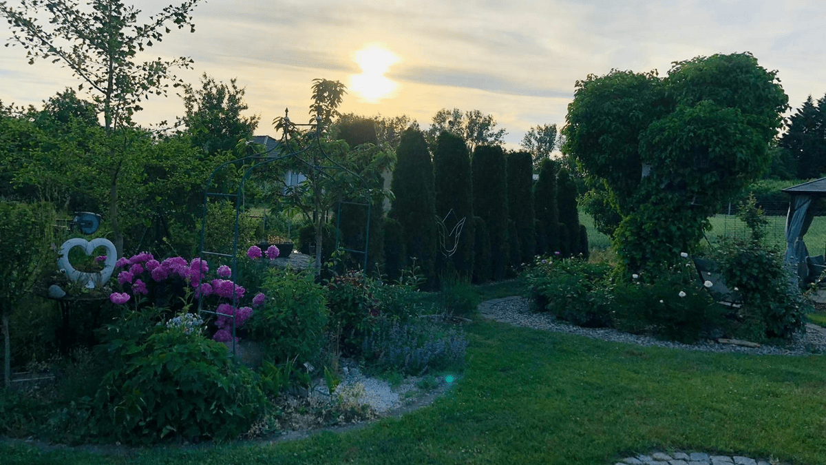 Mit viel Liebe zum Detail angelegter Garten in Grünow. Im Garten befinden sich verschiedene Rosenarten, Lavendel, Schmetterlingsflieder, Buchsbäume, Hortensien in verschieden Arten, ein kleiner Teich und viele weitere mit Liebe gestaltete kleine Details zum Entdecken und Freude haben. Der innovativ angelegte Garten verleiht Ruhe und Wohlbefinden, in der heutigen Zeit einfach gut für Körper und Geist.
