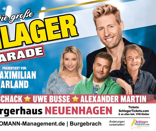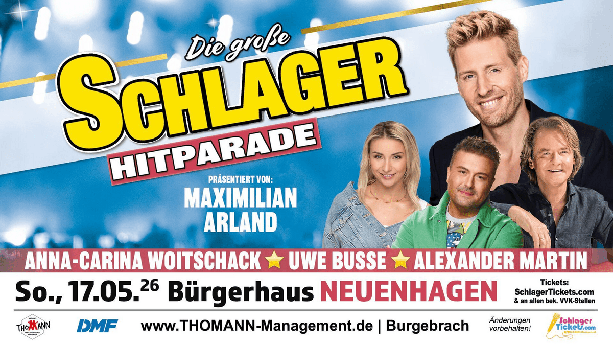 2026 wird groß – Schlager groß! Alles neu macht nicht der Mai, sondern das Jahr 2026! Die große Schlager Hitparade präsentiert sich in ganz neuem Gewand und mit Maximilian Arland, mit einem ganz neuen Moderator. Und der holt sich gleich eine Gästeliste der ganz besonderen Art zu seiner ersten großen Schlager Hitparade ein. Wir freuen uns auf: Anna-Carina Woitschack, Uwe Busse und Alexander Martin.