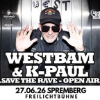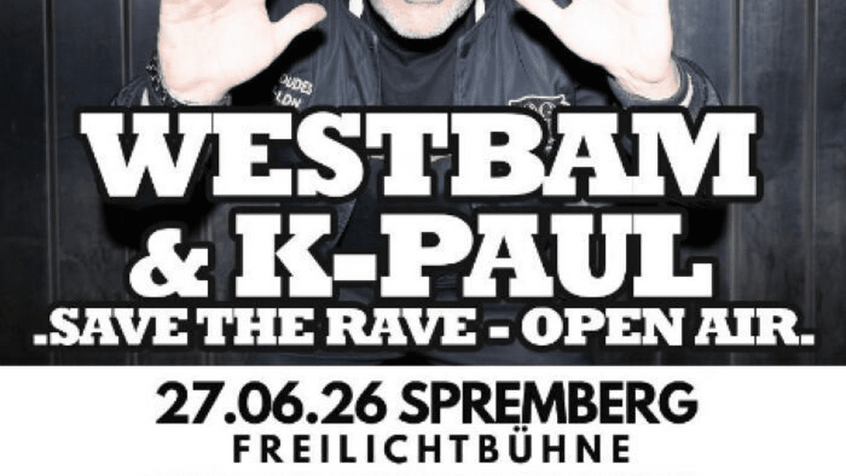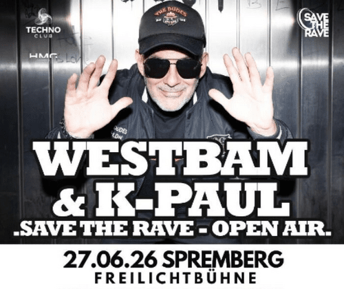 Westbam, der Beatboxrocker, der Terminator, Gründer der Love Parade & Mayday kommt am 27.06.26 zum ersten Mal auf ein Open Air nach Spremberg und bringt natürlich noch jede Menge weitere Acts mit. Erlebt den Megarave mit WESTBAM und K-PAUL an der frischen Luft von 16 - 22 Uhr. SAVE THE RAVE! Tickets in der Stadt & Tourist Information Spremberg