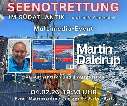 Martin Daldrup, ein renommierter Einhandsegler und Buchautor, navigierte über die Ozeane, wo er sich den Naturgewalten und inneren Herausforderungen stellte. Im Südatlantik kollidierte sein Segelfahrzeug mit einem treibenden Container und sank innerhalb weniger Minuten. In einem multimedial aufbereiteten Vortrag im Forum Mariengarden beleuchtet er seine spektakuläre Rettung sowie die essenzielle Faszination des Hochseesegelns. Dieser Abend bietet Einblicke in existenzielle Grenzsituationen und die nautische Leidenschaft.