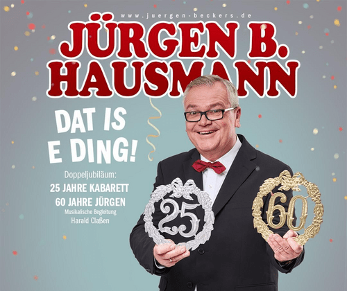 Jürgen B. Hausmann feiert mit seinem Programm "25 Jahre – Dat is e Ding!" ein Vierteljahrhundert Kabarettkunst. Seine unerschöpfliche Kreativität und sein feines Gespür für Alltagskomik garantieren ein Feuerwerk an Pointen. In diesem Jubiläumsprogramm präsentiert er urkomische Anekdoten, die überdreht und dennoch lebensnah sind. Seine Geschichten entspringen den Wohnzimmern, Vereinsheimen und Hobbymärkten des Landes, bevölkert von Charakteren aus dem familiären Umfeld oder der Nachbarschaft. Die Resonanz des Publikums zeigt oft ein Wiedererkennen eigener Erlebnisse. Hausmanns Stärke liegt in seiner Fähigkeit, alltägliche Situationen in treffsichere, amüsante Geschichten zu verwandeln und gewöhnliche Menschen zu Originalen zu machen. Musikalisch begleitet wird er dabei von seinem langjährigen Partner Harald Claßen. Ein Abend voller Humor und Lebensnähe erwartet die Besucher:innen.