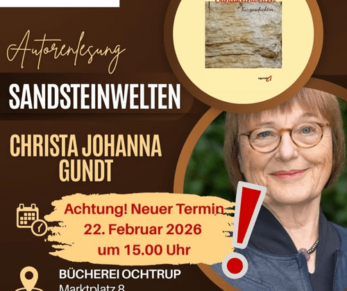 Die Bücherei St. Lamberti in Ochtrup präsentiert eine Autorenlesung mit Christa Johanna Gundt, die Einblicke in ihre Sandsteinwelten gewährt. Diese Veranstaltung bietet einen kulturellen Austausch, ergänzt durch ein ausgewähltes Angebot an Kaffee und Kuchen.