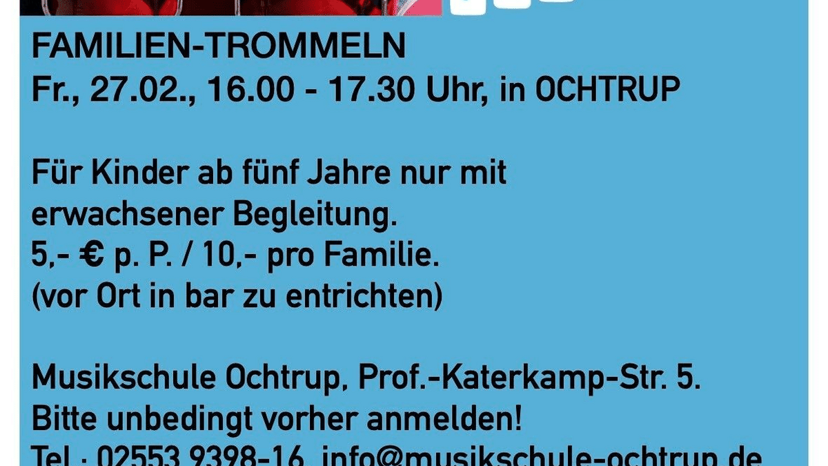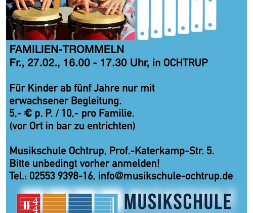 Die Musikschule Ochtrup präsentiert ein Familien-Trommeln, das Kinder ab fünf Jahren in Begleitung erwachsener Personen zur Teilnahme einlädt. Diese Initiative fördert die kollektive rhythmische Interaktion und stärkt das musikalische Miteinander. Sie bietet allen Teilnehmer:innen ein bereicherndes kulturelles Erlebnis.