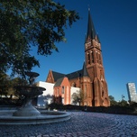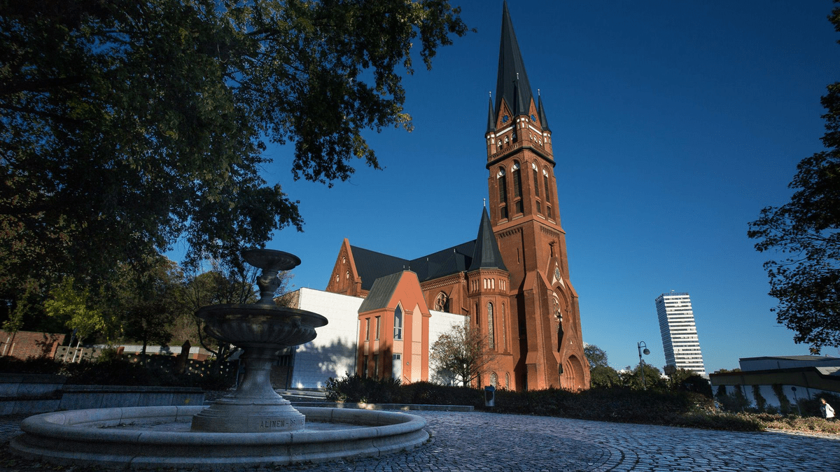 Der Bau der katholischen Kirche nach Plänen des Architekten Engelbert Seibertz begann 1897. Die Kirchweihe als Heilig-Kreuz und Königin-des-Heiligen-Rosenkranz-Kirche erfolgte 1899. Der Name Heilig Kreuz wurde von der ursprünglich in der Grapengießer Gasse zu findenden Kirche übernommen. Der Doppelname entstand auf den Wunsch des zur Zeit der Segnung bereits verstorbenen Pfarrers Erzpriester Julius Winkler, der die Kirche Rosenkranz-Kirche nennen wollte. Das Glasmosaik über dem Hauptportal weist noch heute auf den Rosenkranz hin. Rene Pachmann, Hochschulseelsorger und engagierter Bürger der Stadt führt durch die Kirche und auf den Kirchturm. Ort: Katholische Kirche Franz-Mehring-Straße 4 Weitere Informationen: https://www.vhs-frankfurt-oder.de
