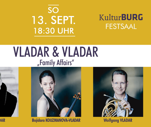 Starpianist STEFAN VLADAR, Philharmoniker WOLFGANG VLADAR und Weltklassegeigerin BOJIDARA KOUZMANOVAVLADAR, präsentieren ein Programm voller Virtuosität, Ausdruckskraft und mitreißender Höhepunkte. Gemeinsam musizieren die renommierten Künstler auf der Bühne der Garser KulturBURG Werke von César Franck und Johannes Brahms – ergänzt durch eine musikalische Überraschung.