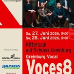 aus London, 2023 nominiert für einen Grammy, zählt zu den führenden A-capella Gruppen weltweit. Sie bieten 500 Jahre Chorliteratur, ein Repertoire von früher Polyphonie bis zu Vokalarrangements der Gegenwart. In seiner 20-jährigen Karriere war das Ensemble in vielen Konzerthäusern zu Gast, darunter die Wigmore Hall London, die Elbphilharmonie Hamburg, das Wiener Konzerthaus, das Sidney Opera House, die Tokyo Opera City, die Mariinsky Concert Hall in Petersburg und viele andere. Durch Online-Lernplattformen für Schüler, Universitäten und Chöre ist ihre Popularität bei jungen Menschen bemerkenswert. Fast eine Million monatliche Hörerinnen und Hörer weist die Musikstreaming-Plattform „Spotify“ aus. Auch auf „Youtube“ ist VOCES8 führend. Und trotzdem besteht Einigkeit, dass ein Liveauftritt von VOCES8 alle Aufnahmen noch übertrifft. Garantiert wird im Rittersaal auf Schloss Greinburg ein einmaliges Konzerterlebnis in Bezug auf Gesang, Stil und Darbietung. Und das ohne Mikrophone, ohne Verstärkung, alles „nur“ mit menschlichen Stimmen erster Güte. Besetzung: Andrea Haines – Sopran