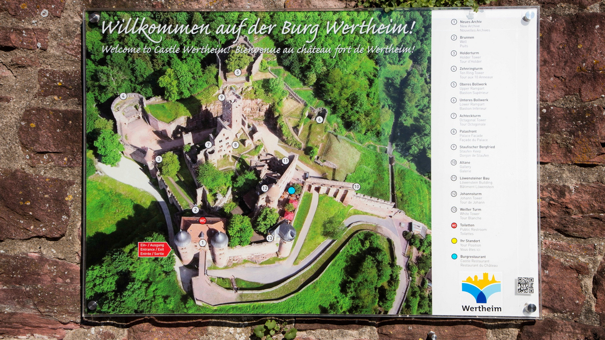 Bollwerk, Bergfried, Rittersleut: Die geführte Erkundung der majestätischen, mittelalterlichen Schlossruine fasziniert alle Gäste - Traumpanorama inklusive! Die Wertheimer Burg ist das Wahrzeichen der Stadt und eine der schönsten und größten Steinburgruinen Süddeutschlands. Die Burganlage kann nahezu komplett besichtigt werden, der Ausblick über die Stadt ist überwältigend! Öffentliche Führungen zur Burg Wertheim finden von April bis Oktober Sonntags um 14:30 Uhr statt. Die Dauer beträgt 1 Stunde und der Treffpunkt ist an der Stiftskirche . Eine Teilnahme ist ohne Voranmeldung möglich.