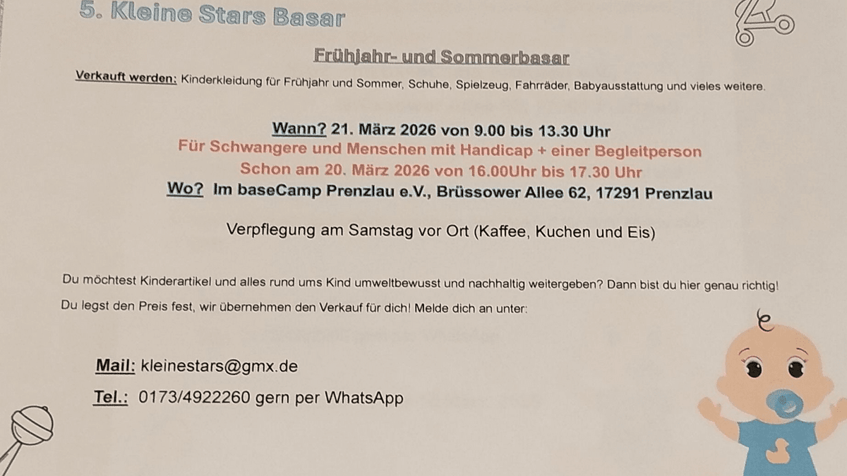Umweltbewusst kaufen & verkaufen – alles rund ums Kind! 👶🌿 Du möchtest Baby- und Kinderartikel nachhaltig kaufen oder verkaufen? Dann bist du bei uns genau richtig! Verkaufen: Du legst deinen Preis fest – wir übernehmen den Verkauf für dich. Kaufen: Shoppen wie im Laden! Komm mit einer großen Tüte oder einem Korb vorbei und stöbere ganz entspannt, ohne Handeln und ohne zu wissen, von wem die Artikel sind. Exklusives Vorab-Shopping: Für Schwangere sowie Menschen mit Handicap inkl. Begleitperson 🗓 Nachhaltig, fair & stressfrei – wir freuen uns auf dich! ♻️💚 Email: [kleinestars@gmx.de](mailto:kleinestars@gmx.de)