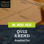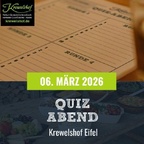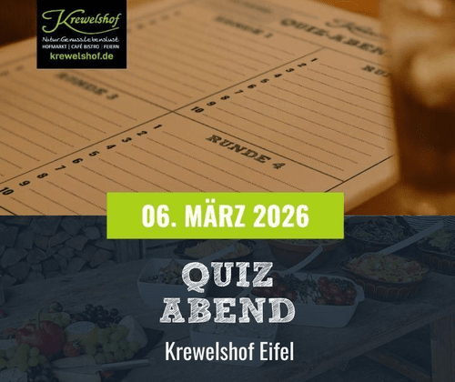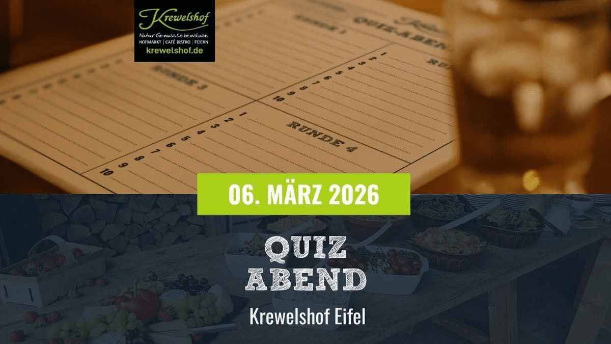 Der Krewelshof Eifel lädt zu einem unterhaltsamen Quizabend ein, der Wissen, Teamgeist und Humor vereint. In geselliger Atmosphäre erwarten die Teilnehmer:innen anspruchsvolle Fragen zu vielfältigen Themenbereichen. Begleitet wird der Abend von Live-Musik, die für die passende Stimmung sorgt. Für das leibliche Wohl ist mit einem liebevoll angerichteten Buffet gesorgt, das unter anderem Currywurst, frische Salate und hausgemachtes Brot umfasst. Die Veranstaltung bietet die Gelegenheit, in Teams von bis zu sechs Personen gemeinsam zu rätseln und neue Kontakte zu knüpfen. Eine vorherige Anmeldung ist erforderlich.