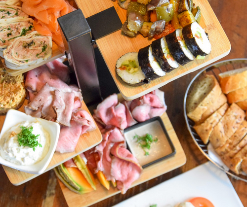 Beginnen Sie Ihr Brunch-Erlebnis mit einer liebevoll angerichteten Vorspeisen-Etagere, die eine Auswahl an feinen Delikatessen bietet – ideal zum Teilen und Probieren.
