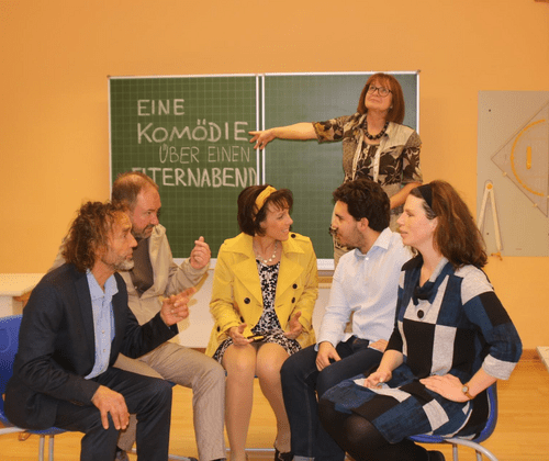 Wer Kinder hat, durchlebt die dargestellte Situation entweder selbst oder als Beobachter. Die kommenden Zeugnisse sind maßgeblich für die Aufnahme in die nächste Schule. Deswegen haben die Lehrer zu funktionieren! Wenn nicht? Na, dann helfen die Eltern „etwas“ nach!!!! Bissig und realistisch hält uns das Stück wieder mal den Spiegel vor. Wir ertappen uns selbst und andere. Von spannungsgeladener Atmosphäre mit Theater im Theater bis zum Blick hinter die Fassade jedes einzelnen, sobald die Ereignisse daran bröckeln, zeigt dieses Stück wie vielschichtig, wie maskiert wir sind. „Anders“ inszeniert hat Catharina Lühr für pointierte Komik und damit Ihr keinen Vergleich ziehen könnt mit Euch bekannten Elternabenden.