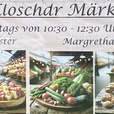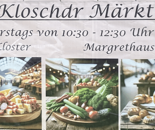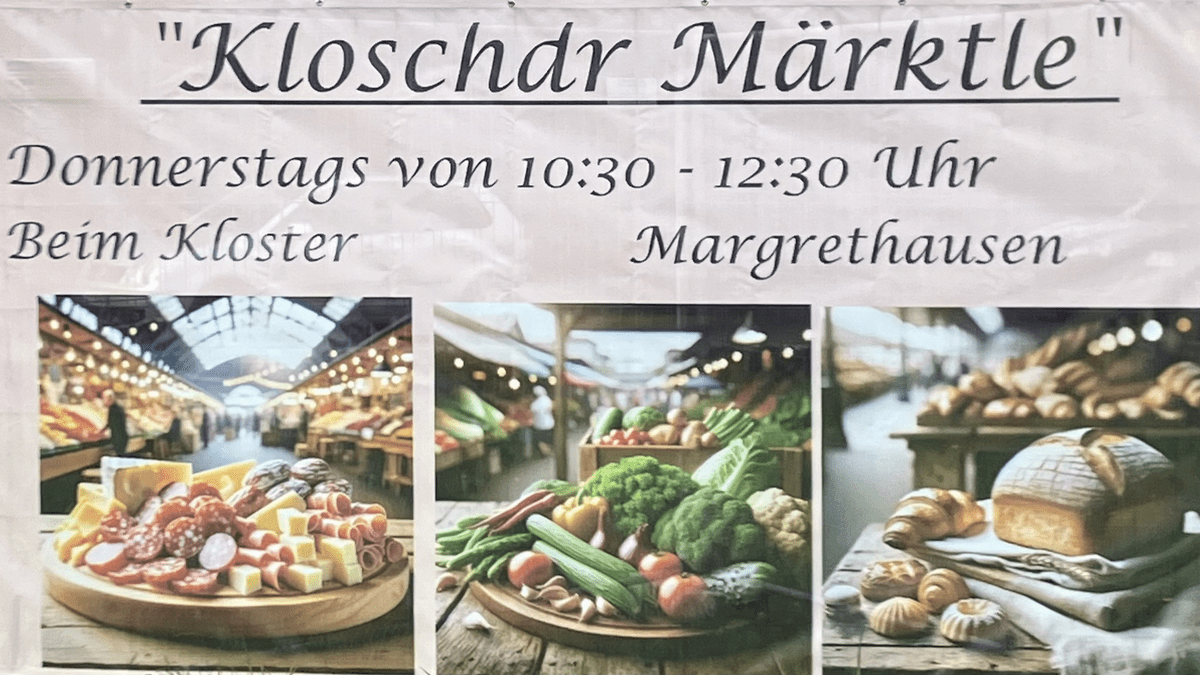 Kleiner Wochenmarkt mit frischen Obst und Gemüse, Eiern und Fleisch- und Wurstwaren vor dem Kloster in Albstadt-Margrethausen. Wochenmarkt mit Lebensmittel-Verkauf. Der Markt findet jeden Donnerstag von 10.30 bis 12.30 Uhr beim Kloster in Albstadt-Margrethausen statt.