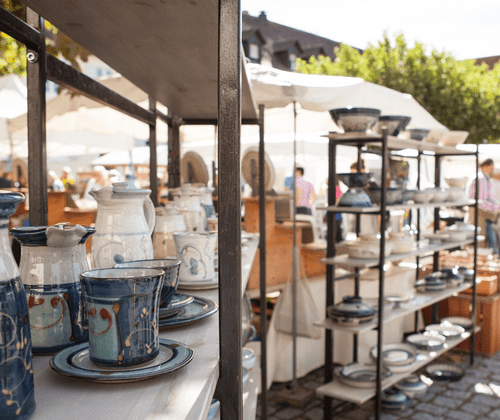 Traditioneller Töpfermarkt mit Keramiker innen aus dem gesammten Bundesgebiet unter freiem Himmel vor historischer Kulisse in Kandern. Viele führende Keramiker/-innen aus dem gesamten Bundesgebiet sowie aus dem Ausland sind an diesem Wochenende in Kandern versammelt. Gediegene Gefäßkeramik in individuellster Ausprägung, exklusive Brenntechniken, besondere Dekore, figürliche und bildhauerische Arbeiten sowie Kachelofendesign und Gartenkeramik werden hier unter freiem Himmel gezeigt.