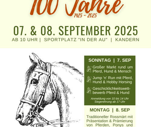 Der Chanderner Rossmärt am 08.09.2025 ab 10 Uhr bietet in "In der Au" beim Sportplatz traditionell Pferde, Ponys, Gespanne und Fuhrwerke zum Staunen. Präsentation & Prämierung von Pferden, Ponys und Gespannen. Der Chanderner Rossmärt rundet die Feiertage am 08.09.2025 ab. Ab 10 Uhr veranstalten die Stadt und der Reitclub Kandern in traditioneller Weise "In der Au" beim Sportplatz den Rossmärt. Bestaunen Sie neben herausgeputzen Pferden und Ponys auch geschmackvoll hergerichtete Gespanne und Pferdefuhrwerke. Sie sind herzlich eingeladen!