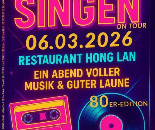 Einfach nur Singen - das ist das Mitmach-Format in Bad Essen. Singen für jedermann und jede Frau! Während das Playback läuft, erscheinen die Song-Texte auf der großen Leinwand, sodass die fehlende Textsicherheit keine Entschuldigung ist. Jeder so, wie er/sie kann. Der Spaß an der Freude steht dabei eindeutig ganz vornean. Motto: das beste aus den 80er Jahren. Wer möchte, kann vorab lecker asiatisch speisen. Ab 19:30 Uhr starten wir dann die Veranstaltung und im Anschluss legt der DJ noch ein paar heiße Beats für "nur-Tänzer" auf.
