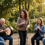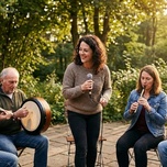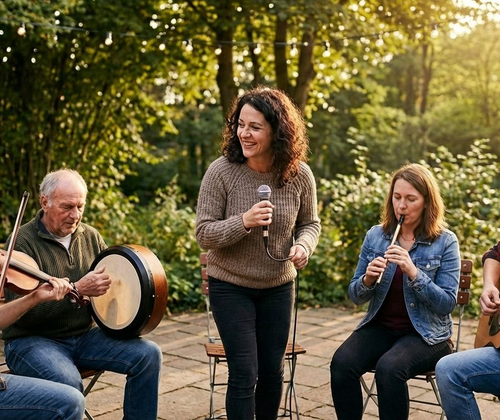 Um die irisch stämmige Sängerin Marie Morris haben sich vier Musiker versammelt, die die Menschen auf die irische Folkmusik einstimmen. Sie laden das Publikum zum Mitsingen ein.