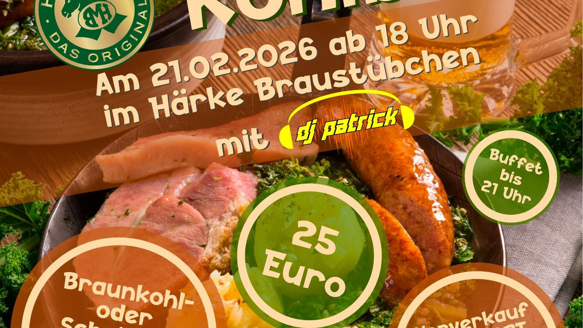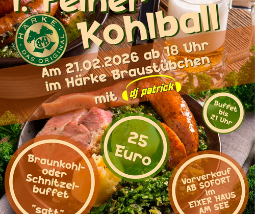 Der 1. Peiner Kohlball im Härke Braustübchen! Wann? Samstag, den 21. Februar 2026 Wo? Im Härke Braustübchen, Am Werderpark 5 in 31224 Peine Einlass ab 18 Uhr, bis 21 Uhr Braunkohl- oder Schnitzelbuffet Musik mit DJ Patrick Legere Kleidung erwünscht 25€ p.P. (Eintritt und Buffet); Vorverkauf ab sofort am Eixer Haus am See