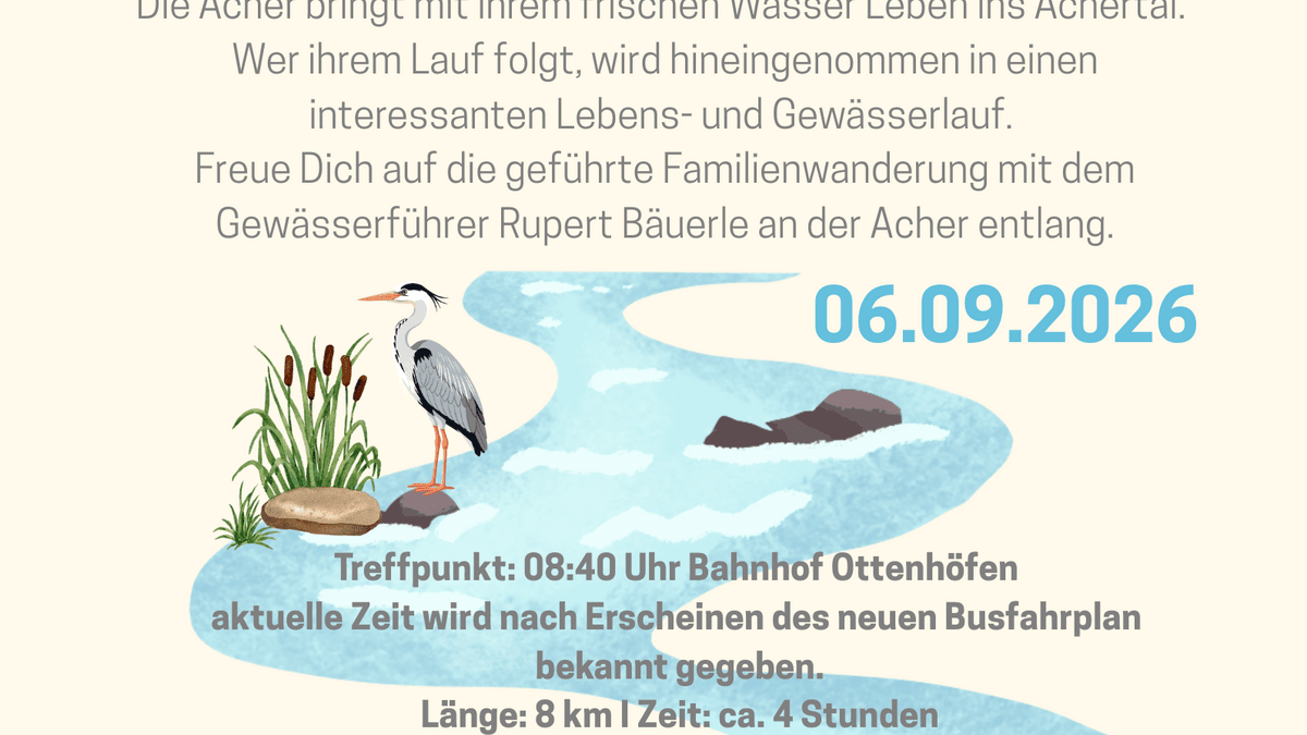 Die ACHer-toTAL schön Die Acher bringt mit ihrem frischen Wasser Leben ins Achertal. Wer ihrem Lauf folgt, wird hineingenommen in einen interessanten Lebens- und Gewässerlauf. Sie hat das Tal geformt, Lebensräume für Pflanzen und Tiere geschaffen und schließlich den Menschen ermöglicht, im Tal eine Lebensgrundlage zu finden. Wir fahren mit dem Bus zum Ruhestein und starten an der Quelle in den Sandsteinriffs, begleiten die Acher auf ihrem Weg ins Tal bis zum Ziel Ottenhöfen. Die Themenbereiche dieser Tour reichen von der Geologie und Entstehung des Schwarzwaldes, der Nutzung der Wasserkraft im Laufe der Jahrhunderte, bis zur Besiedelung und Entwicklung des Tales, welche im Laufe der Wanderung direkt quasi am "Wegesrand" gesehen und erlebt werden können. Treffpunkt: 08:40 Uhr Bahnhof Ottenhöfen – aktuelle Zeit wird nach Erscheinen des neuen Busfahrplan bekannt gegeben. Länge: 8 km I Zeit: ca. 4 Stunden Vesper & Getränk bitte mitbringen. Gewässerführer: Rupert Bäuerle Achtung: Die Tour ist nicht kinderwagentauglich! Empfohlen für Kinder ab 7 Jahre. Anmeldung (bitte per Mail): baeuerle-kappelrodeck@t-online.de , 0151 70132138 Gebühr: keine