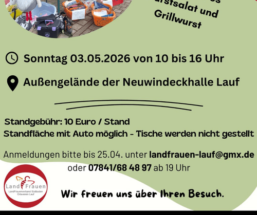 Flohmarkt der LandFrauen Lauf Für das leibliche Wohl ist gesorgt. Neben Kaffee und Kuchen gibt es Wurstsalat und Grillwurst. Standgebühr: 10 € / Stand Standfläche mit Auto möglich - Tische werden nicht gestellt. Anmeldungen bitte bis 25.04.2026 unter landfrauen-lauf@gmx.de oder Tel. 07841-684897 ab 19 Uhr. Wir freuen uns über Ihren Besuch!