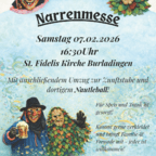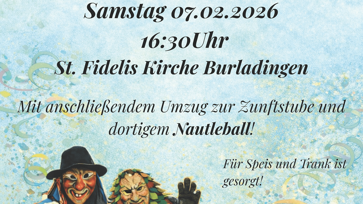 Am Samstag, 07. Februar 2026 veranstaltet die Narrenzunft Nautle die traditionelle Narrenmesse in der St. Fidelis Kirche in Burladingen. Mit anschließendem Umzug zur Zunftstube und dortigem Nautleball. Für Speis und Trank ist gesorgt! Kommt gerne verkleidet und bringt Familie & Freunde mit - jeder ist willkommen!