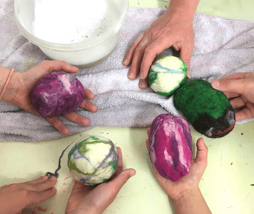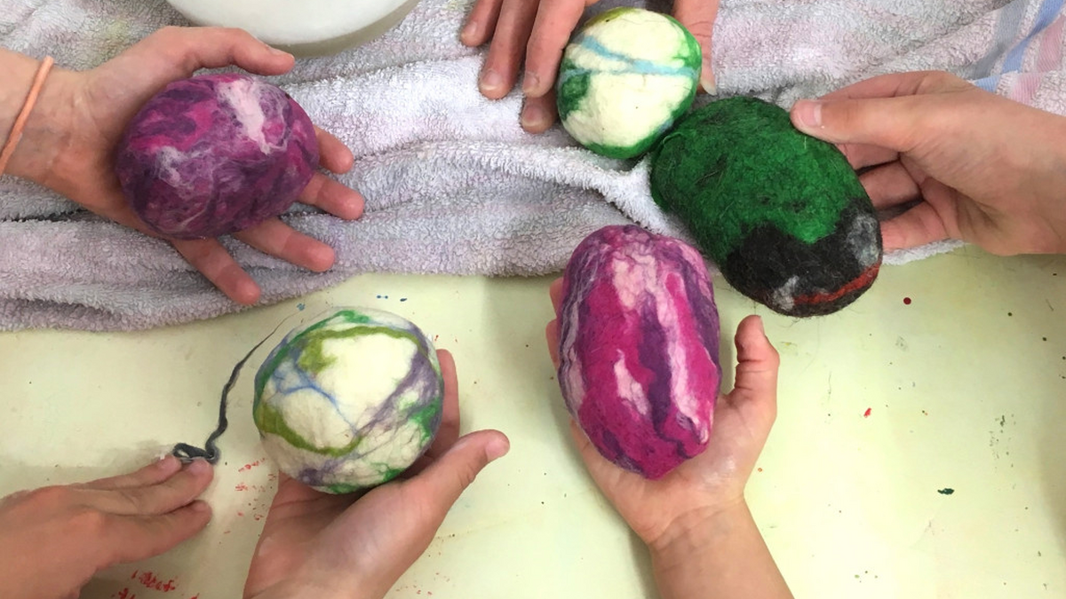 Kinder ab 6 Jahren können in diesem Kurs bunte Ostereier aus Schafwolle filzen.