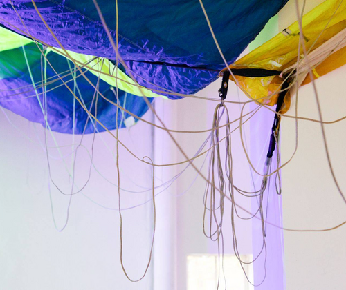 Der zweite Raum öffnet sich als begehbare Installation: Gespannte Fallschirme bilden eine durchlässige Zwischendecke, die Licht sichtbar führt und die Architektur neu definiert. Beim Durchschreiten wird die Gravitation verhandelbar — ein sanftes Spiel aus Stillstand und Schwebe. Die Falte wird zur Schwelle, die Berührung zum Zugang zu einem tieferen Raum.