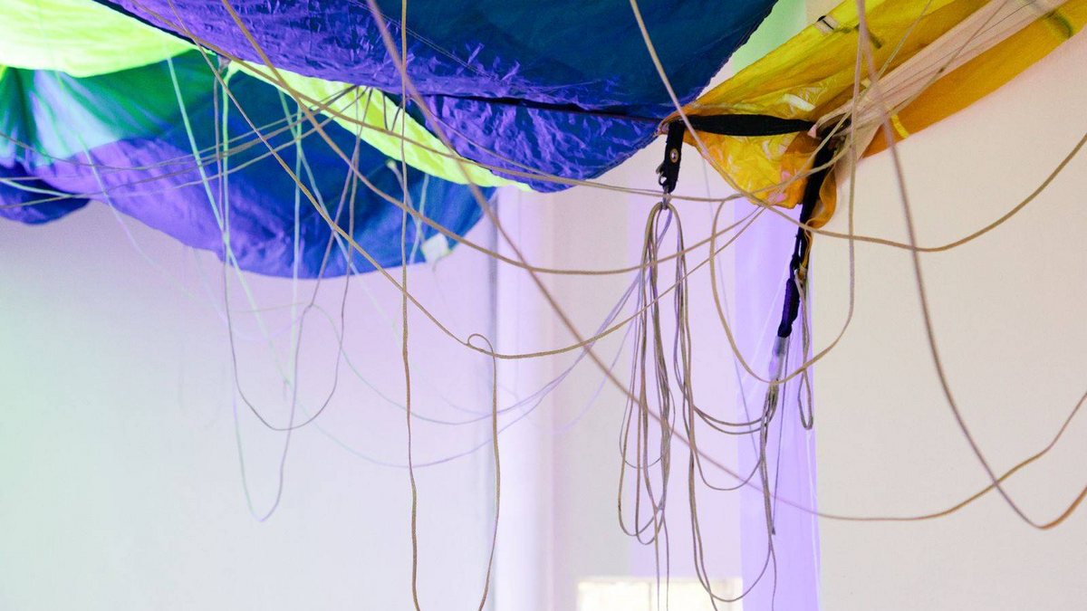 In When Air Holds Its Breath wird die Zeit selbst spürbar. Clemens Wolf verwandelt Fallschirme in skulpturale und malerische Strukturen, die einen Moment festhalten, an dem alles kippen könnte — zwischen Fall und Auftrieb, Risiko und Rettung. Die Werke zeigen eine Welt im Schwebezustand: ein Atem, der angehalten wird, bevor Bewegung entsteht.