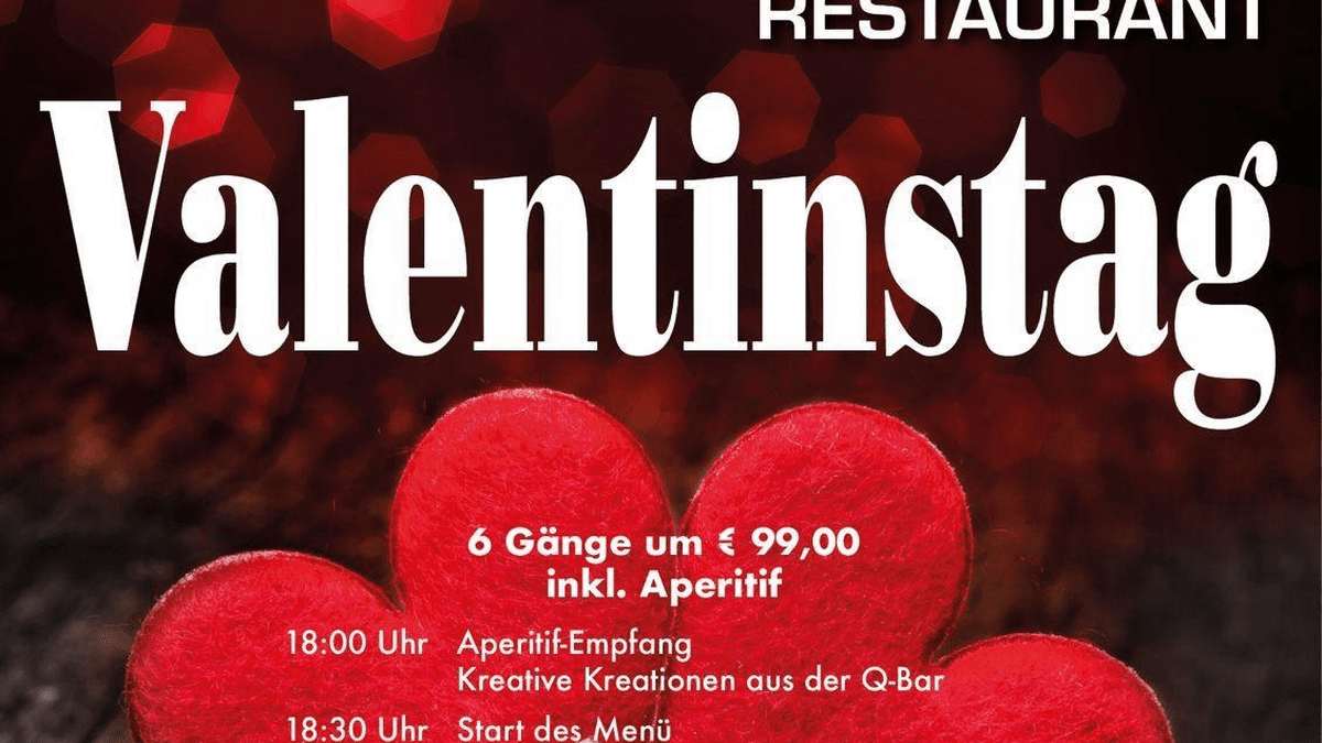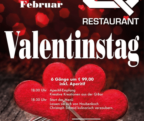 Valentinstag im QAb 18 Uhr Aperitif-Empfang mit kreativen Kreationen aus der Q-Bar.Ab 18:30 Uhr Start des Menüs. Lassen Sie sich von Haubenkoch Christoph Schmid kulinarisch verzaubern.Wir bitten um Reservierung unter Telefon +43 07562 20 789 oder office@q-restaurant.at