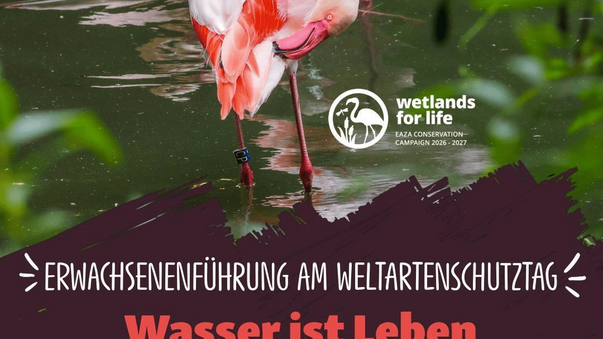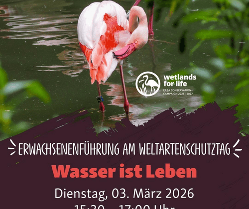 Unter dem Motto „Wasser ist Leben“ rückt der Lebensraum Wasser in den Fokus: Erfahren Sie, warum aquatische Ökosysteme für Tiere, Pflanzen und Menschen so essenziell sind und wie der globale Verlust von Feuchtgebieten Klima, Biodiversität und Trinkwasserversorgung beeinflusst. Im Rahmen dieser exklusiven Tour entdecken Sie faszinierende Wasserbewohner im Zoo – von Fischen und Wasserschildkröten bis hin zu Flamingos, Pelikanen und dem Biberbiotop – und erhalten spannende Hintergrundinfos zur neuen „Wetlands For Life“-Kampagne des Europäischen Zooverbands.