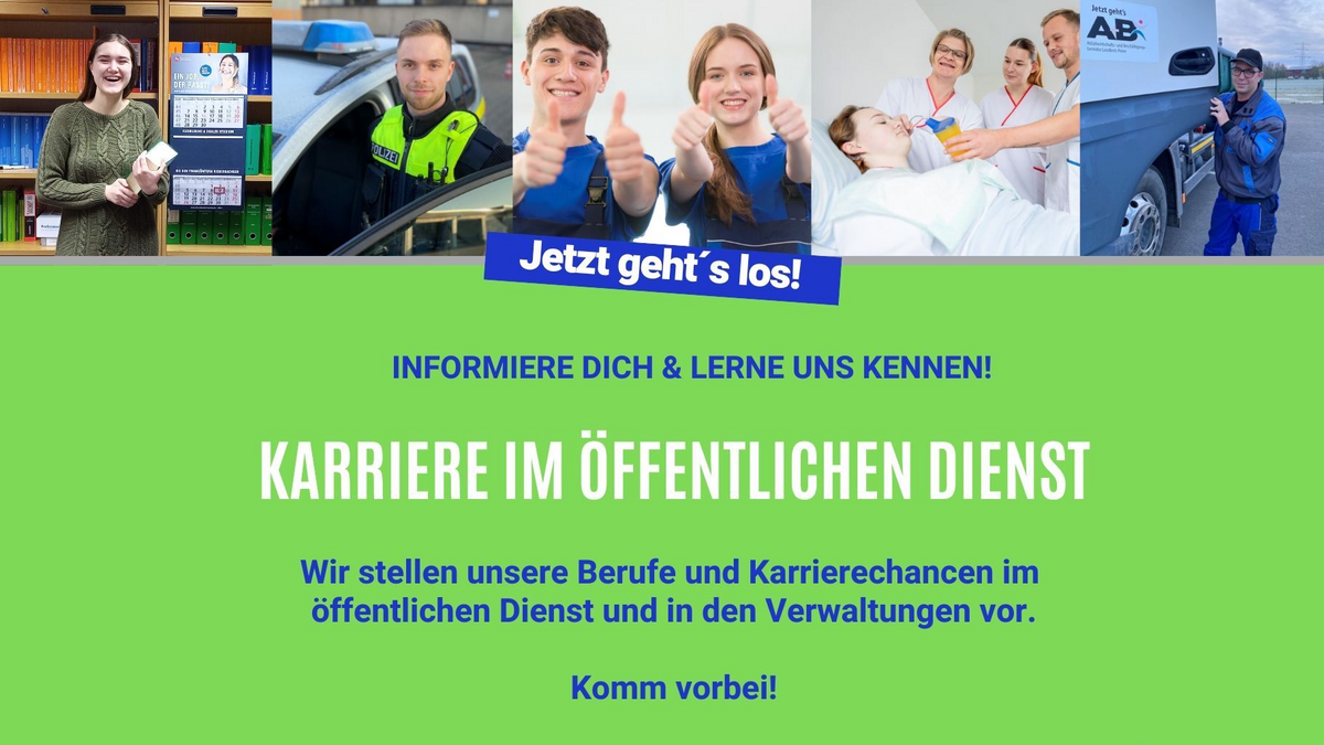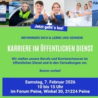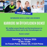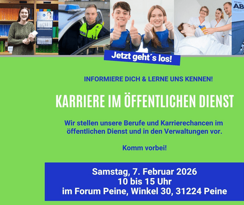Gestalten Sie mit uns Institutionen und Verwaltungen die Zukunft im Landkreis und der Stadt Peine! Auf der "Karriere im Öffentlichen Dienst" am Samstag, den 7. Februar 2026 von 10 bis 15 Uhr im Forum Peine möchten wir unsere Jobs vorstellen und Stellensuchenden, sowie Personalverantwortliche zusammenbringen. Es gibt tolle Karrierechancen in der Allgemeinen Verwaltung, Gesundheitswesen, Finanzämtern, Polizei, Krankenhäuser, Pflegeeinrichtungen, Bildung, Finanzen, Versorgung (Abfall, Wasser), IT, Kunst uvm. Kommen Sie gern vorbei und informieren Sie sich über Karrierechancen im Öffentlichen Dienst am 7. Februar im Forum Peine.