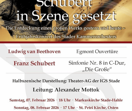 „Schubert in Szene gesetzt“ – Einladung zu einer außergewöhnlichen Entdeckungsreise zu einem großen klassischen Werk. „Na super, eine Schubert-Sinfonie, letzte Woche hatten wir noch Filmmusik, da war wenigstens etwas los. Mal schauen was der Lehrer denn jetzt von uns will…“ – diese ungewohnten Töne sind in den diesjährigen Frühjahrskonzerten des Stader Kammerorchestern unter dem Motto „Schubert in Szene gesetzt“ zu hören. Zusammen mit der Theater-AG der IGS Stade präsentieren wir ein Konzert, in dem ein klassisches Werk nicht nur aufgeführt, sondern im wahrsten Sinne des Wortes gleich mehrfach entdeckt wird. Es geht um Franz Schuberts Sinfonie Nr. 8 in C-Dur, genannt „Die Große“, welche in den Jahren 1825/1826 entstand, jedoch zu Schuberts Lebzeiten nie aufgeführt wurde. Dennoch ist die Aufführungsgeschichte gut bekannt, denn Robert Schumann fand das Werk auf einer Reise nach Wien 1838 im Nachlass des Komponisten wieder und war begeistert: „Hier ist noch Leben in allen Fasern, Colorit bis in die feinste Abstufung, Bedeutung überall, schärfster Ausdruck des Einzelnen, und über das Ganze endlich eine Romantik ausgegossen, wie man sie nur von Franz Schubert kennt.“ Schumann regte daraufhin die Aufführung in Leipzig unter der Leitung von Felix Mendelssohn-Bartholdy an, welche ein voller Erfolg wurde. Durch die halbszenische Darstellung der Theater AG der IGS Stade wird diese Entdeckungsgeschichte für die Zuhörer im Konzert greifbar gemacht. Dass die „Die Große“ bis heute nachwirkt, kommt im zweiten Teil der Werkeinführung zum Ausdruck. Dort ist das Werk Thema einer sehr fortschrittlichen Musikklausur, und eine Schülerin setzt sich mit der Sinfonie auseinander. „Zum Glück haben wir … hochmoderne Abspielgeräte.“, denkt sie sich, denn tatsächlich stehen ihr in dieser neuartigen Klausur das gesamte Stader Kammerorchester und sogar einzelne Stimmgruppen zum Nachhören einzelner Passagen zur Verfügung. Dass dadurch die klugen Gedanken zum Werk nur so sprudeln, versteht sich von selbst. Das Publikum hört dabei direkt mit und kann anschaulich an den Gedankengängen der Schülerin teilhaben und so die Sinfonie mitentdecken. Im zweiten Teil des Konzerts erklingt dann die gesamte Sinfonie von Anfang bis Ende. Eröffnet wird das Konzert mit der Egmont-Ouvertüre von Ludwig van Beethoven, der ein großes künstlerisches Vorbild und ein Wegbereiter für Franz Schubert war. Die Kandidatin umschreibt diese Tatsache später treffsicher mit den Worten „Naja, Schubert war ja auch Beethoven-Fanboy“. Das Projekt wird vom Landschaftsverband Stade sowie von der Alles-Gute-Stiftung der Kreissparkasse Stade gefördert. Die Konzerte unter der Leitung von Alexander Mottok finden statt am Samstag, den 07. Februar 2026 um 18 Uhr in der Markuskirche Stade-Hahle und am Sonntag, den 08. Februar 2026 um 17 Uhr in der St. Petri Kirche Osten. Der Eintritt beträgt € 18 für Erwachsene und € 8 für Schüler und Studierende. Karten gibt es an der Abendkasse.