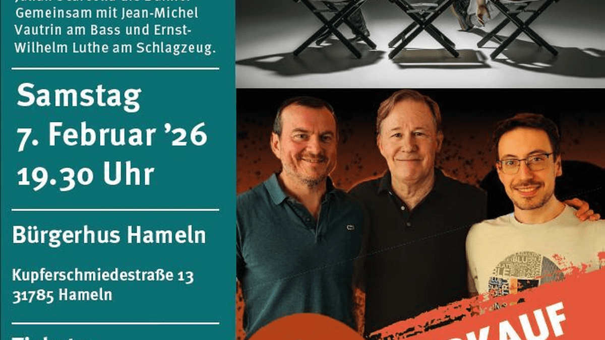 Ein Abend, der sowohl Jazzliebhaber als auch neugierige Musikfreunde begeistern wird. Den Auftakt macht das Jazzduo „Trio ohne D“ – bestehend aus Thomas Schierschke am Piano und Boris Fähndrich am Schlagzeug. Im Anschluss übernimmt das Trio des Ausnahmegitarristen Julian Scarcella die Bühne. Gemeinsam mit Jean-Michel Vautrin am Bass und Ernst-Wilhelm Luthe am Schlagzeug.