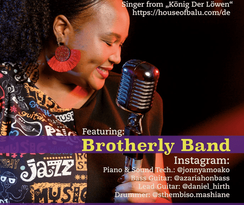 BALU- Balungile Gumede ist eine in Südafrika geborene Sängerin und Musicaldarstellerin die für ihre dynamische Kunstferigkeit bekannt ist. Seit 2013 ist sie fester Bestandteil von Disneys Der König der Löwen als Shenzi und Sarabi. Mit "Brotherly Band" bringt Sie mitreißende Darbietungen aus Gospel, Jazz, Soulful, South African Jazz und R&B von Balungile auf die Bühne. Am Piano und Soundtechnik begleitet Jonny Amoako, Bass Guitar Azaria Honbass, Lead Guitar Daniel Hirth und Drummer Sthembiso Mashiane. You make me feel, Like a natural Woman (Aretha Franklin), Let`s Fall in Love (Ella Fitzgerald), Pata Pata (Miriam Makeba) oder Hallelujah (Leonard Cohen) und mehr.