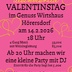 Ab geht’s in den Saal zur Valentinstags-Party mit DJ Chris (Ehemalig im Touch Me), Tanzmusik und richtig guter Stimmung. Ob Paar, Single oder Freundesrunde – alle sind willkommen, wir lassen den Abend gemütlich und lustig ausklingen.