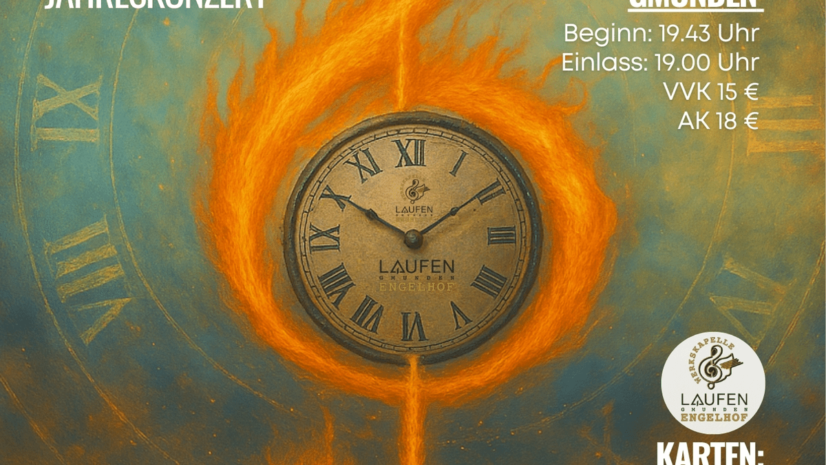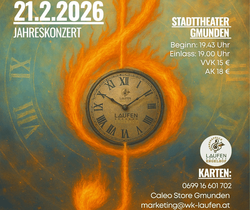 GMUNDEN. Unter dem Motto „Durch Zeit & Klang“ lädt die Werkskapelle Laufen Gmunden‑Engelhof am Samstag, 21. Februar 2026, zu einer musikalischen Zeitreise im Rahmen des traditionellen Jahreskonzerts ein. Eröffnet wird der Konzertabend im Stadttheater Gmunden um 19:43 Uhr vom vereinseigenen Laufenten‑Jugendorchester unter der Leitung von Michaela Gassenbauer. Die jungen Musikerinnen und Musiker zeigen dabei die lebendige Nachwuchsarbeit der Werkskapelle im Laufenten‑Jugendclub.