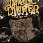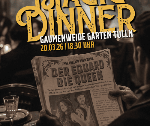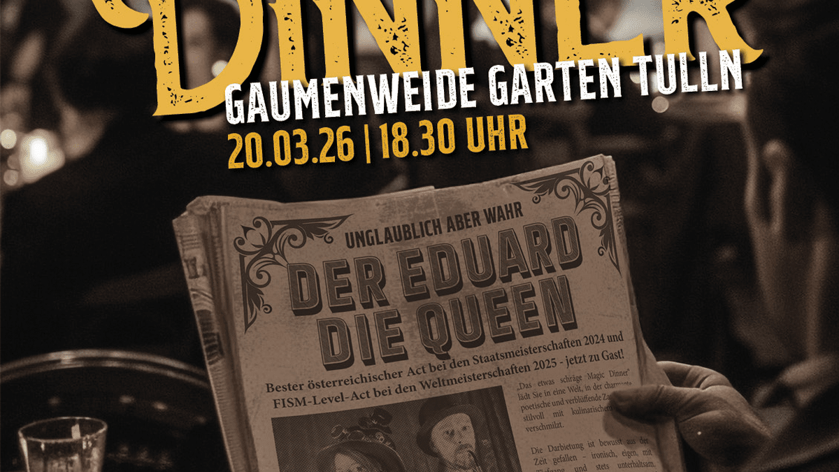 Die Queen of Hearts und der Eduard entführen Sie in eine Welt zwischen Eleganz, Witz und verblüffender Magie. Während Sie ein köstliches 3-Gang-Menü genießen – von feinen Vorspeisen über Hühnerfilet im Erdäpfelmantel auf Pilzrahmsauce und gegrillten Zucchini oder Schwammerlgulasch mit Semmelknödel bis hin zu Grießflammerie auf Mangoragout – entfaltet sich zwischen den Gängen ein Abend voller Charme, Magie und Herzblut.