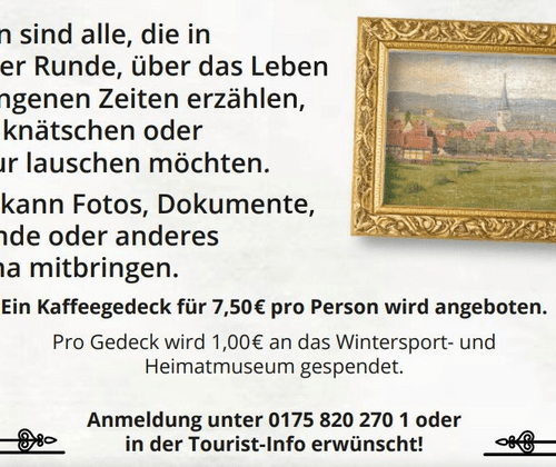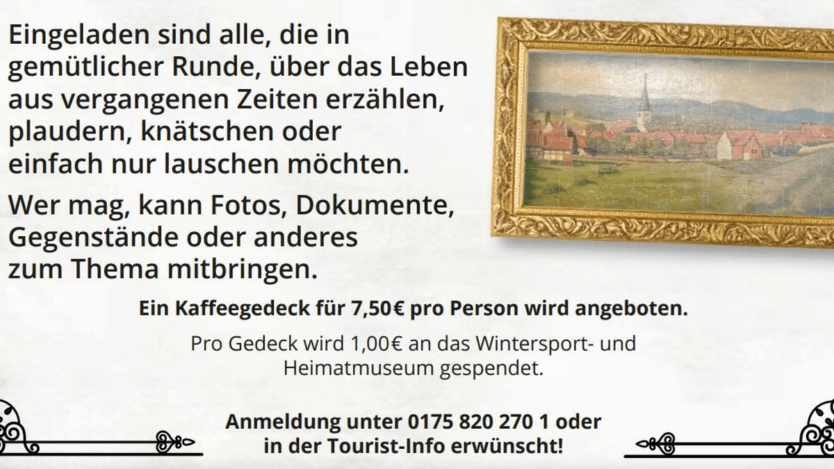 Kaffeegedeck 7,50 Euro, Eintritt frei, Anmeldung in der Tourist-Information Bad Sachsa erwünscht.