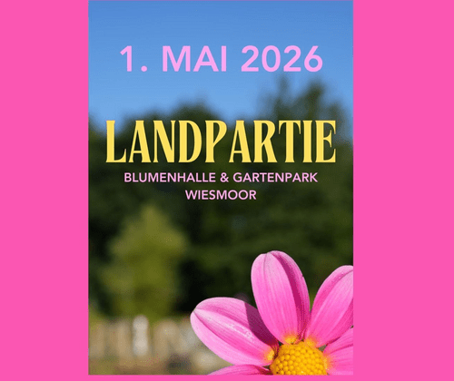 Im wunderschönen Ambiente der Blumenhalle und des Gartenparks in Wiesmoor wird am 1. Mai 2026 von 10 bis 18 Uhr wieder die beliebte Landpartie stattfinden. 100 Ausstellende bieten dabei ein bunt gemischtes Angebot für Haus und Garten. Liebevolle Handwerkskunst und ein vielfältiges gastronomisches Angebot werden in ein musikalisches Rahmenprogramm eingebunden und sorgen für unterhaltsame Stunden. Freuen Sie sich auf Freddy the Piper, m&m acoustica, Jann Poppen und die Volkstanzgruppe. Auch das reizvolle Torf- und Siedlungsmuseum hat an diesem Tag geöffnet und lässt die traditionelle Lorenbahn fahren. Verbinden Sie einen Besuch auf der Landpartie mit einem Museumsbesuch und tauchen Sie ein in die Geschichte von Wiesmoor. Das Großevent bietet auch in diesem Jahr viele neue attraktive Angebote und wir freuen uns bei bestelltem Sonnenschein auf eine wundervolle Landpartie.