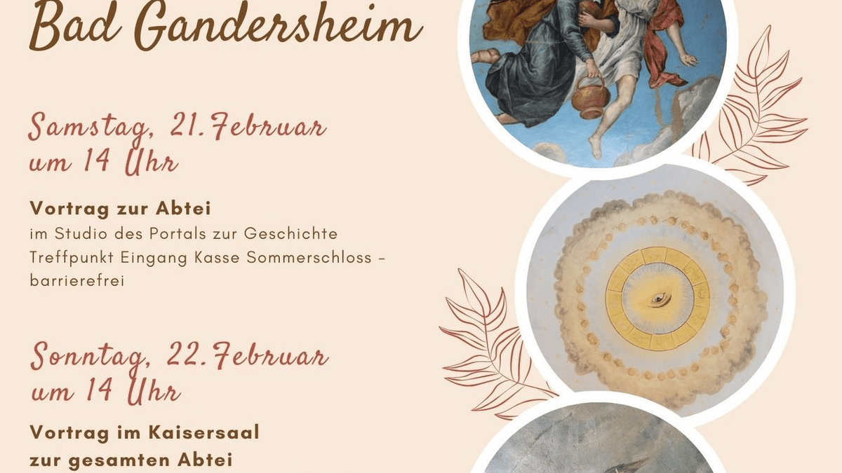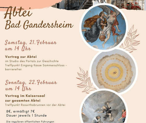 Im Mittelpunkt stehen die Geschichte und Bedeutung der Abtei sowie Einblicke in Bereiche, die heute nicht öffentlich zugänglich sind. Anhand von Fotografien aus der Abtei werden Räume und Details vorgestellt, die normalerweise verborgen bleiben, ergänzt durch Erläuterungen zur Nutzung und Entwicklung der Anlage. Treffpunkt: Roswithabrunnen vor der Abtei Preis: 8€, ermäßigt 7€