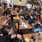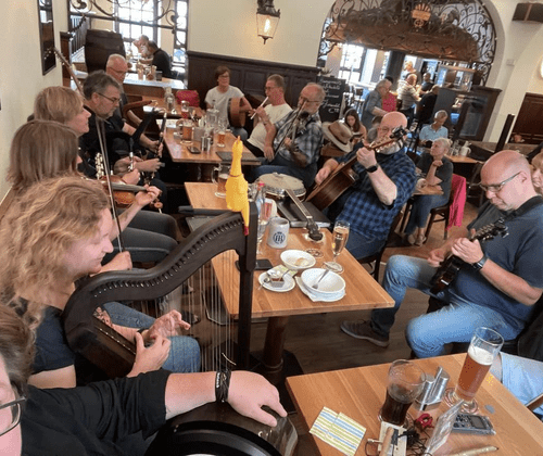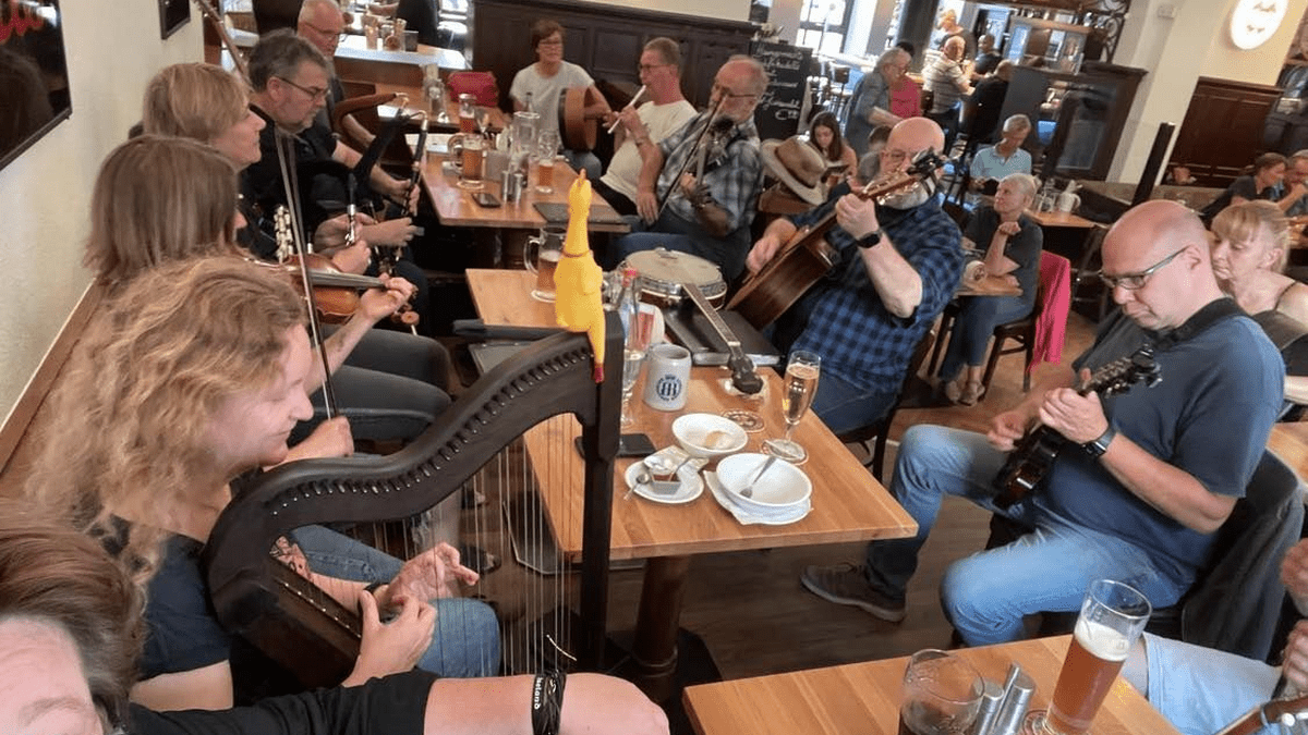 Die Musikerinnen und Musiker der Owl Town Folk Scene (gegründet 1974) treffen sich, um die Gäste mit traditionellen Jigs, Reels, Hornpipes und Songs aus Irland und Schottland zu unterhalten. Typische Instrumente wie Uilleann Pipes (IrischerDudelsack), Harfe, Fiddle, Flöte, Mandoline, Bouzouki und Tin Whistle sorgen für den stilechten "Sound". Ein kleiner Hinweis: Es handelt sich nicht(!) um ein Konzert, sondern um eine Session. "Session" werden in Irland die informellen Zusammenkünfte von Musikerinnen und Musikern (meist in Kneipen) genannt. Es gibt keine klare Anfangs- und schon gar keine Schlusszeit. Es gibt keine feste Band, wer Zeit hat, kommt. Manchmal kommen die Musiker von weither angereist oder sind auf der Durchreise, haben möglicherweise noch nie zusammen gespielt. Es gibt kein Programm. Gespielt werden "Tunes", also (meist irische und schottische) Melodien, die die Anwesenden im Repertoire haben, und möglichst zusammen spielen können.