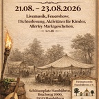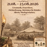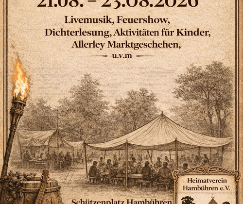 Taucht ein ins Mittelalter! Vom 21. bis 23. August 2026 verwandelt sich Hambühren wieder in einen Ort voller Lagerleben, Handwerk und Spektakel: Das 2. Mittelalterliche Treyben zu Hambühren lädt Groß und Klein ein zum Staunen, Mitmachen und Genießen. Freut euch auf einen stimmungsvollen Markt mit historischem Handwerk, Leckereyen für jeden Gaumen, Musik und Kurzweyl, sowie auf echte Mittelalter-Atmosphäre mit Gewandung, Klängen und flackerndem Feuerlicht. Ob ihr als Familie kommt, als neugierige Besucher oder in voller Montur – hier wird Geschichte lebendig Merkt euch den Termin – und bringt Freund, Kind und Spaß mit: Hambühren treybt wieder mittelalterlich!