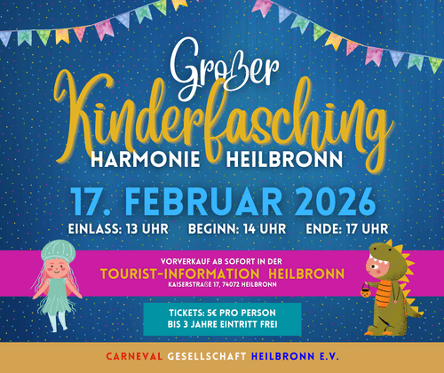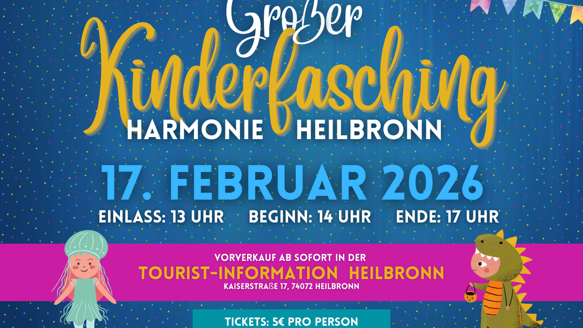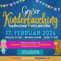 Freut euch auf Tanz, Musik, Spiele auf der Bühne und viele Spielstationen im Saal. Gemeinsam lachen, tanzen und Spaß haben! Großer Kinderfasching 2026 Es heißt wieder: rein ins Kostüm und ab in die Harmonie Heilbronn! Freut euch auf einen fröhlichen Nachmittag mit ganz viel Musik, Tanz und guter Laune. Unsere Tanzgarden und Solisten stehen auf der Bühne, dazu gibt’s lustige Spiele zum Mitmachen. Auch im Saal ist jede Menge geboten, sodass garantiert keine Langeweile aufkommt. Wir tanzen, singen, lachen zusammen und haben einfach eine richtig gute Zeit.